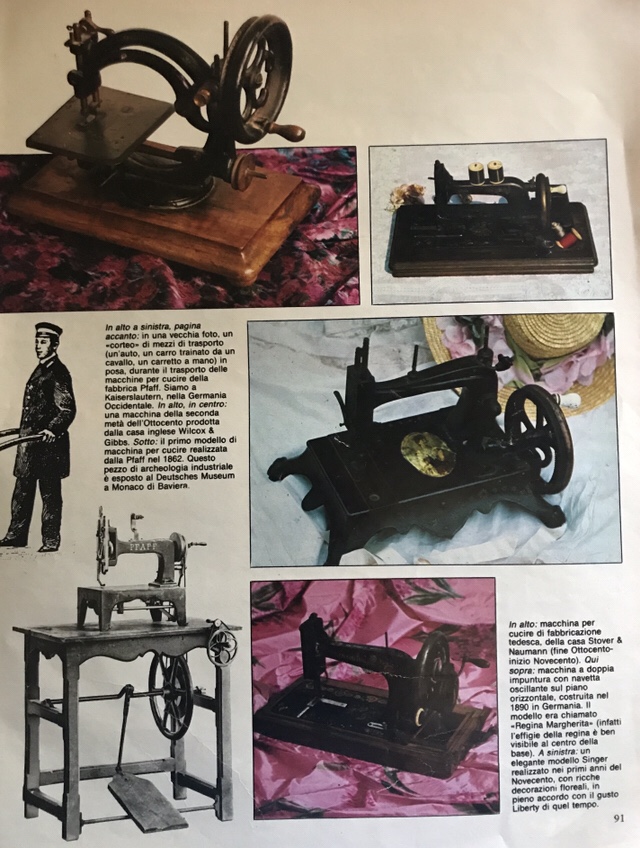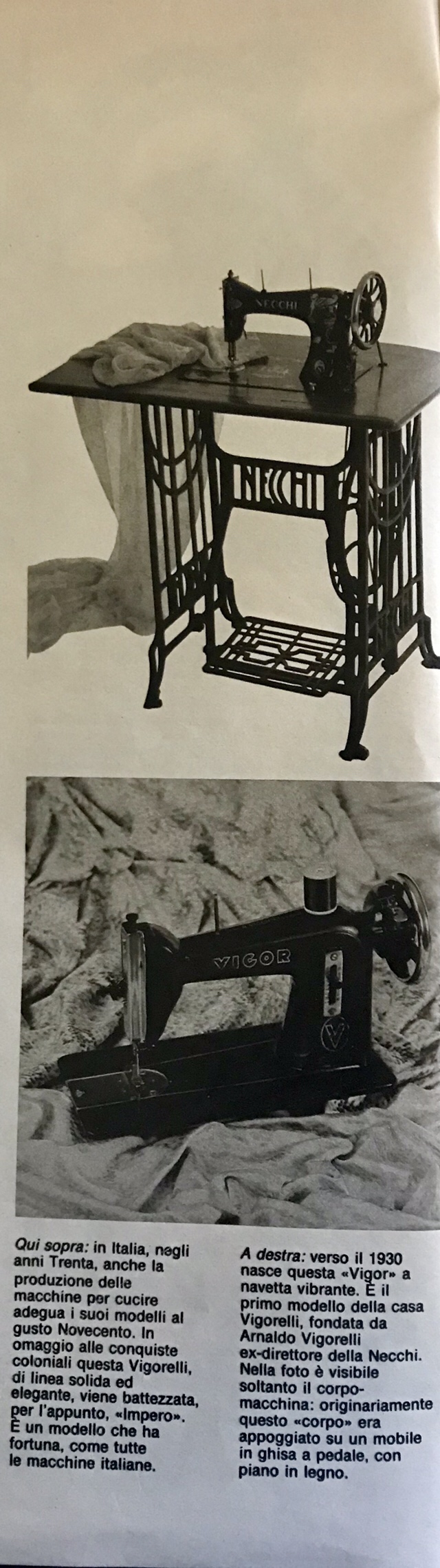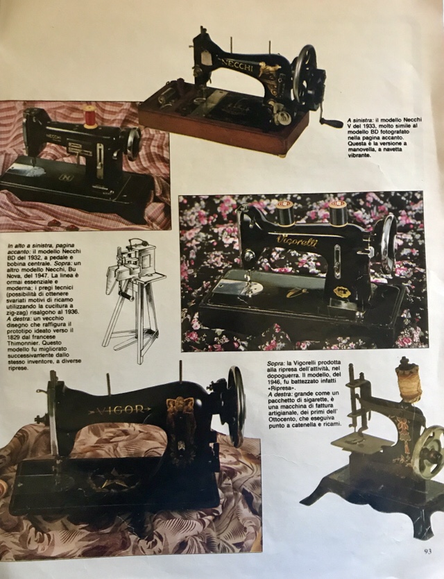 In Italia si inizia la produzione delle macchine da cucire un po’ in ritardo ma in compenso l’eccellente qualità del prodotto fa sì che venga richiesto all’estero. Un esempio ne sono le Vigorelli prodotte nella fabbrica del Cav. del lavoro Arnaldo Vigorelli e le Necchi di Vittorio Necchi. Queste ultime sono riuscite ad affermarsi in tutto il mondo al punto che vennero aperte fabbriche in Argentina, Jugoslavia, Messico e Spagna.