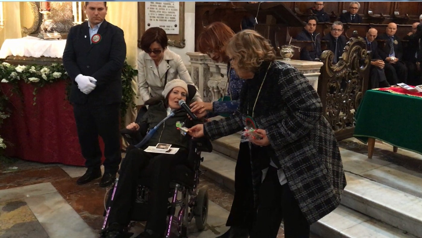 «Il Circolo femminile – ha detto la presidente Mariella Aurite, non mascherando l’emozione – quest’anno ha il privilegio di consegnare la tessera ad una donna che non ha mai perso la forza di combattere, diventando testimone di Cristo ed esempio di coraggio e tenacia». Profondo il messaggio che Laura ha rivolto alle socie e ai tanti devoti di S.Agata presenti in chiesa.