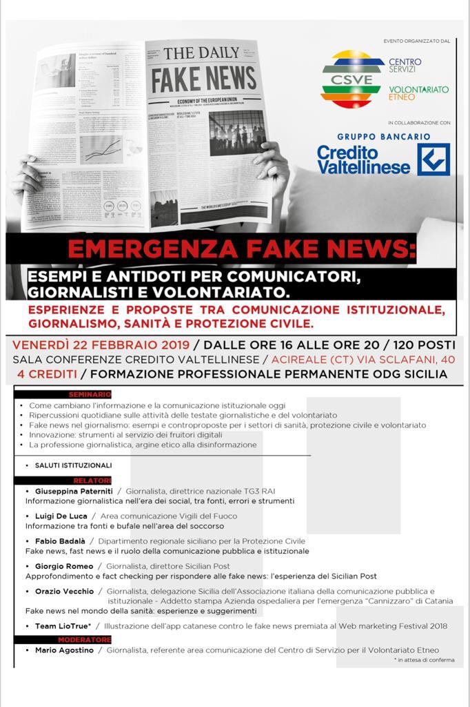 Venerdì 22 febbraio, nella sede del Gruppo Bancario Credito Valtellinese di Acireale, si è tenuto il seminario sull’emergenza delle “Fake News” organizzato dal Centro Servizi Volontariato Etneo.