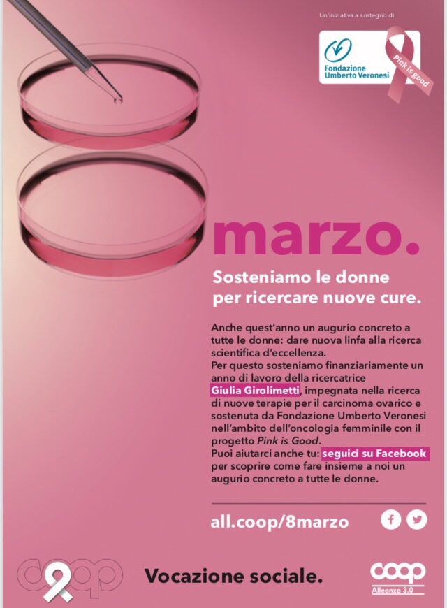 Coop Alleanza 3.0 festeggia l’8 marzo con un augurio concreto per le donne, sostenendo un progetto tutto al femminile: che promuove la salute delle donne e, al tempo stesso, dà lavoro a una professionista della ricerca medico-scientifica d’eccellenza (un settore che, specie in Italia, vive numerose difficoltà, e che, ancora oggi, riserva agli uomini maggiori opportunità). La Cooperativa contribuisce infatti per il secondo anno al progetto “Pink is Good” di Fondazione Umberto Veronesi, che finanzia la ricerca scientifica d’eccellenza e l’importanza della prevenzione contro i tumori femminili, finanziando una borsa di ricerca annuale del valore di 33 mila euro per una dottoressa che studia i tumori ovarici. I fondi andranno alla dottoressa Giulia Girolimetti – 34 anni, di Chiaravalle (An), laureata in Genomica funzionale e Scienze biologiche, ricercatrice all’Ospedale San’Orsola dell’Università degli Studi di Bologna – impegnata nell’individuazione di nuove terapie nel trattamento del carcinoma ovarico: uno dei più insidiosi, difficile da prevenire e curare, perché, essendo asintomatico, viene spesso diagnosticato tardi. La ricerca di Girolimetti indaga il ruolo dei mitocondri, per identificare i meccanismi alla base della resistenza alle cure e testare combinazioni di farmaci per prevenirne l’insorgenza. Nel 2018, il contributo è stato destinato invece alla dottoressa Mariaelena Pistoni dell’Ospedale Santa Maria Nuova di Reggio Emilia, per studiare il legame fra i farmaci che influenzano il Dna e le cellule tumorali del seno.