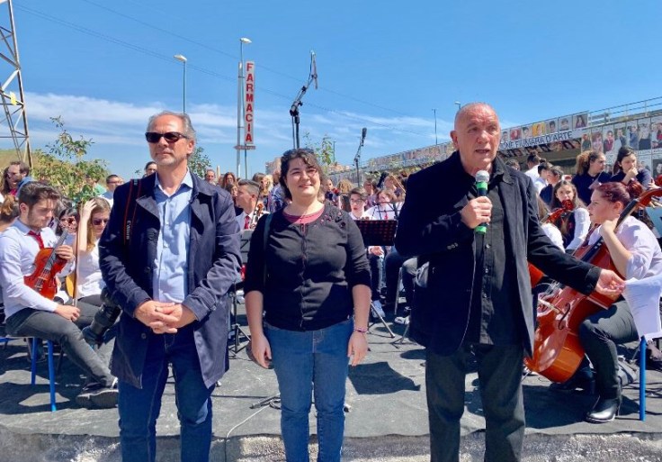«Il Cantico segna un percorso iniziato anni fa con la Porta della Bellezza – ha spiegato la dirigente dell’Istituto Musco Cristina Cascio – che ha lasciato un’impronta forte, unendo tutti nell’intento di riappropriarci di un’identità che sembrava perduta. Oggi questo cammino si riapre grazie ad Antonio Presti, con le immagini della gente che testimoniano la vivacità e la voglia di lanciare segnali forti nel nostro territorio. È un percorso di bellezza interiore su cui vogliamo scommettere, in primis attraverso le scuole, agenzie educative che devono trasferire quel senso civico di cui si nutre il mondo». Mani sul petto per cantare l’Inno di Mameli, con la consapevolezza che occorre stare uniti per superare la linea di confine dell’ombra, che a volte vela la quotidianità con problemi e criticità: «Lo Stato è vicino a Librino per sostenere i cittadini – ha dichiarato il prefetto di Catania, Sua Eccellenza Claudio Sammartino – l’opera che Presti, insieme a voi, sta consegnando alla città, rappresenta un grande incoraggiamento per continuare a lavorare; un contributo prezioso offerto con grande generosità. In questo momento difficile e delicato per il capoluogo etneo, proprio dalle periferie deve partire il cambiamento. Librino ci ha messo la faccia e questo è un contributo che ognuno di voi ha dato in maniera decisiva per il futuro».