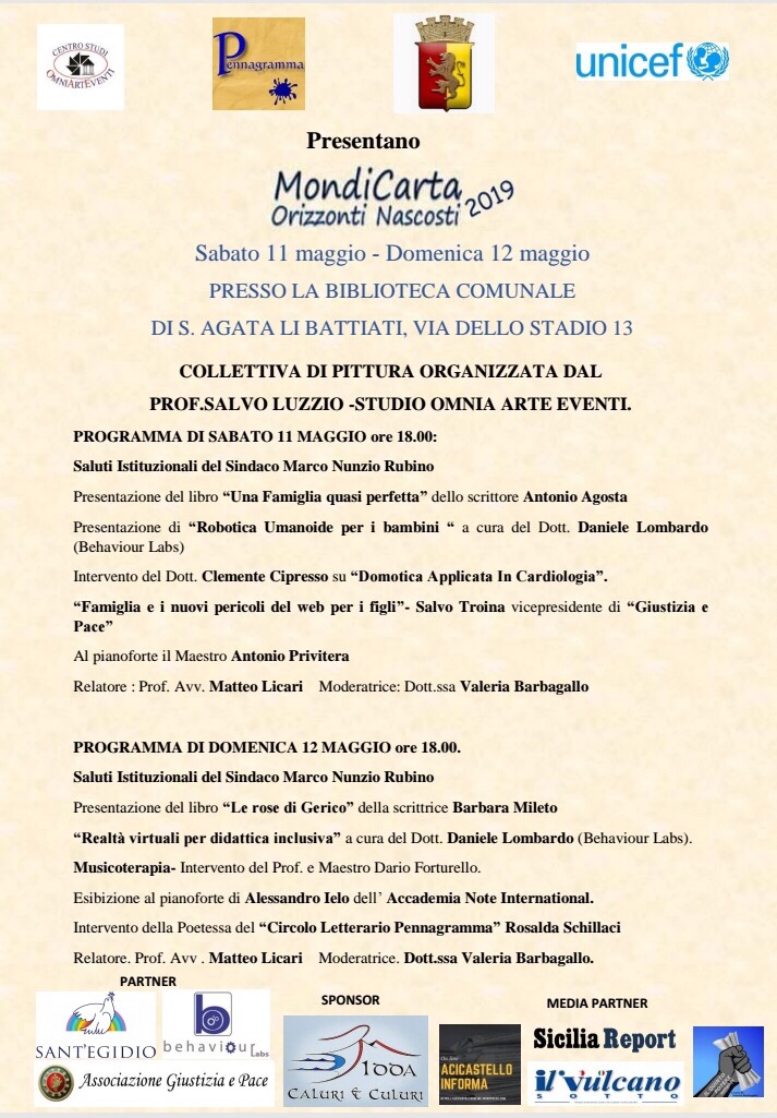 l’itinerario del percorso letterario “MondiCarta Orizzonti Nascosti 2019“, organizzato dal Circolo letterario Pennagramma, ,iniziato a San Giovanni La Punta e che proseguirà a Scordia e che si concluderà con la presentazione del libro di Clemente Cipresso, alla biblioteca comunale Bellini di Catania. Gli eventi hanno finalità solidale a favore di Unicef.