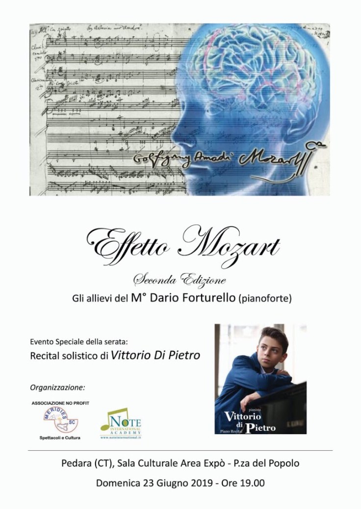 Alla Sala Culturale area Expo di Pedara Domenica 23 Giugno ore 19.30, l’Accademia Note International presenta la seconda edizione di “Effetto Mozart”.