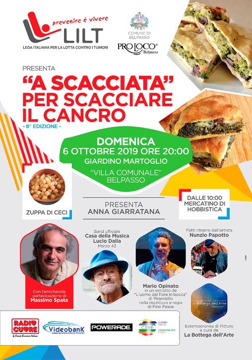 Domenica 6 ottobre a Belpasso, presso il Giardino “Martoglio”, si terra l’ottava edizione de “A Scacciata per scacciare il cancro”, promossa dalla LILT (Lega Italiana per la Lotta contro i Tumori) di Catania e dalla locale delegazione, col patrocinio del Comune di Belpasso e della Pro Loco, che ha come obiettivo la raccolta di fondi a favore dell’attività dell’associazione. Dalle 10 in poi, e fino alla conclusione della manifestazione, si potrà visitare il “Mercatino di hobbistica” mentre, in serata, con un piccolo contributo si potrà degustare la scacciata siciliana e, in collaborazione con l’associazione Mo.I.Ca, anche la zuppa di ceci. L’evento, condotto da Anna Giarratana, come sempre vedrà alternarsi momenti di spettacolo e interventi su salute e prevenzione. Interverranno la dottoressa Maria Grazia Villari, medico, psicoterapeuta e docente della “Scuola Europea di Psicoterapia Funzionale”, che parlerà su “L’impatto della malattia oncologica nella famiglia”; e la dottoressa Rossella Salemi, biologa, dottoranda di ricerca presso il Dipartimento “Biometec” dell’Università di Catania, che parlerà di “Efficacia dei trattamenti antitumorali”. Lo spettacolo vedrà protagonisti il cabarettista Massimo Spata, la Casa della Musica Lucio Dalla, l’attore Mario Opinato in un estratto de “L’uomo dal fiore in bocca” di Pirandello nella riscrittura e regia di Pino Pesce.«Fra le tante manifestazioni annuali che la Lilt propone nella nostra provincia – dichiara il Presidente della LILT di Catania, dottoressa Aurora Scalisi – la “Scacciata per scacciare il cancro” rappresenta una bella festa d’autunno, da vivere insieme agli amici in un clima di convivialità, ascoltando buona musica, sorridendo con gli sketch proposti e, soprattutto, ottenendo informazioni utilissime per accogliere uno stile di vita sano improntato sulla prevenzione».Aggiunge Claudia Doria, responsabile LILT per il volontariato: «Le diverse raccolte fondi delle trascorse edizioni della “Scacciata per scacciare il cancro” hanno consentito di realizzare campagne di sensibilizzazione sulla prevenzione del tumore al seno e del melanoma, ma anche di contribuire all’acquisto di strumenti medici per la diagnosi precoce. Per questo 2019 abbiamo deciso di indirizzare la raccolta sia per le campagne di prevenzione, sia per l’acquisto di parrucche per donne meno abbienti in terapia che ne facciano richiesta». Michele Milazzo