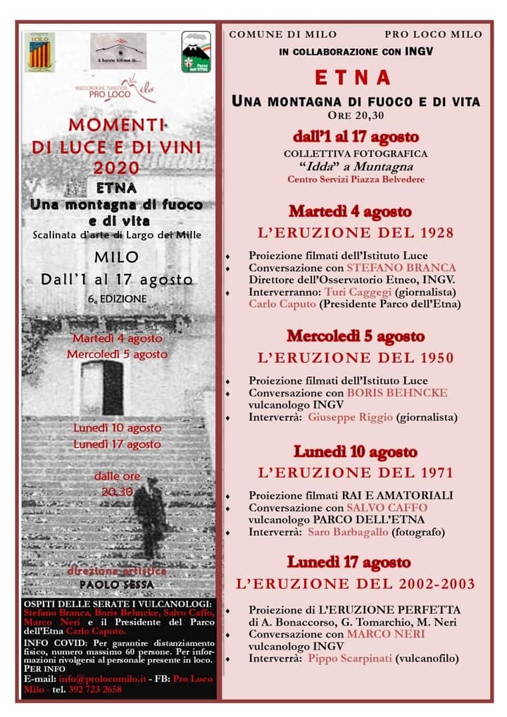 Questa VI edizione è dedicata ad alcune fra le più importanti eruzioni storiche dell’Etna: 1928 (4 agosto), 1950 (5 agosto), 1971 (10 agosto), 2002 (17 agosto). Ospiti illustri, i vulcanologi dell’INGV Stefano Branca (Direttore), Boris Behncke, Marco Neri e Salvo Caffo, vulcanologo del Parco dell’Etna. Inizio alle ore 20:30.