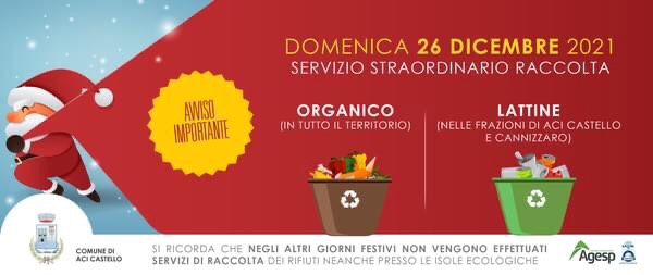 Il Sindaco Carmelo Scandurra e l’Assessore Salvo Danubio informano che, in via straordinaria, verrà effettuato il servizio porta a porta per la raccolta dell’ORGANICO domenica 26 dicembre in tutto il territorio comunale.