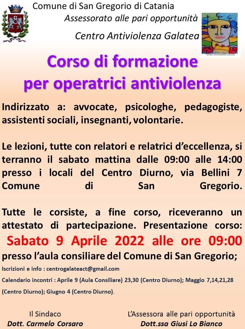 Il Corso è organizzato dal Centro antiviolenza Galatea, presieduto dall’avv. Loredana Mazza, col patrocinio del Comune di San Gregorio, assessorato alle Pari opportunità diretto da Giusi Lo Bianco. Per tutte le corsiste un attestato di partecipazione.