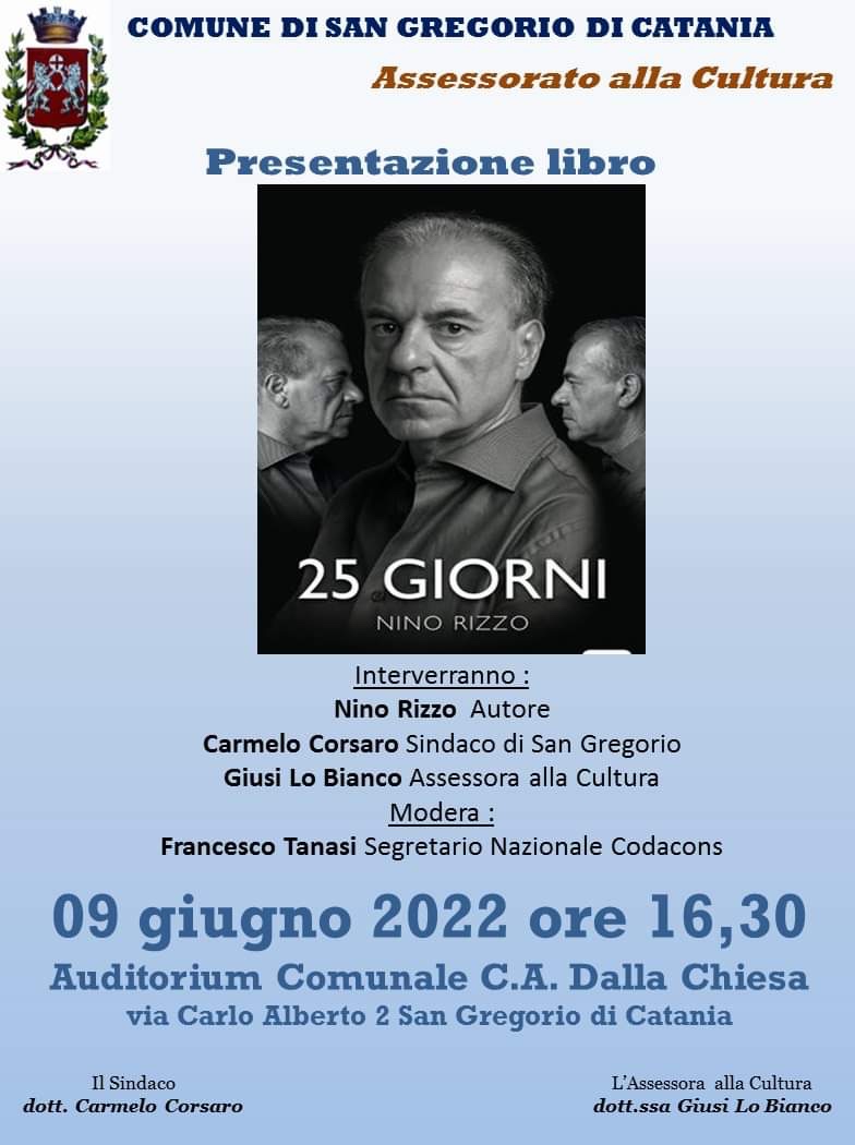 San Gregorio, “25 GIORNI” Presentazione del libro di Nino Rizzo, giovedì 9 giugno