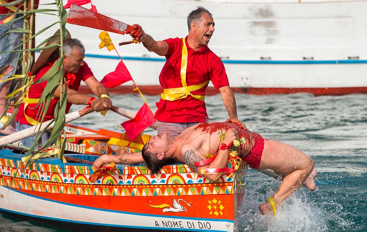 Tutto inizia con la calata dei pescatori verso il mare. Sei uomini si avviano ballando (sulle note di musiche tradizionali ritmate, suonate da un corpo bandistico), ostentando calzoni corti stracciati, una maglia rossa e una fascia gialla a tracolla (che rappresentano i colori simboleggianti il Santo Patrono), un cappellaccio di paglia, ed infine cinti sulla vita da un cordone che tra loro li collega. Arrivati sulla Piazza Giovanni Verga, antistante la chiesa madre, invocano San Giovanni Battista per propiziare la pesca. Poi il corteo festoso si dirige verso il molo (nello specchio d’acqua antistante lo Scalo di Alaggio) dove viene atteso da tutto il corteo di paesani, turisti e curiosi. Tra gli attori della pantomima, tre iniziano la cala della barca (che viene addobbata con fiori e nastri rossi e gialli), due prendono posto sul molo in modo da poter seguire le fasi della pesca. Il “rais”, che sta sul molo, é colui che grida e dirige la pesca (urlando tradizionali frasi in dialetto) mentre con fare minaccioso muove una canna di foglie fresche sulla mano destra ed un ombrello sulla sinistra. Si comincia la pesca “do pisci”, nella prima parte rappresentato da un esperto nuotatore che furtivamente si immerge nello specchio di acqua teatro della pantomima, nascondendosi tra le numerose imbarcazioni colme di gente che osserva più da vicino l’avvenimento e urla verso i protagonisti incitandoli. Il “rais”, dall’alto di uno scoglio, avvista l’uomo-pesce e lancia segnali. Così il pesce ( o l’uomo-pesce ) viene preso e levato a bordo ma prontamente riesce a fuggire dalle mani dei pescatori già pronti a tagliarlo a fette. Comincia l’inseguimento e la vera lotta con la preda che viene nuovamente infilzata, ferita e catturata, e con il mare che si tinge del suo sangue rosso. Due pescatori che si trovano sulla barca tengono saldamente l’uomo-pesce per le braccia e le gambe e, mentre minacciano di squartarlo con una grande mannaia, questo si agita ormai conscio del suo destino. Ma dopo essersi dimenato a lungo, riesce a scappare nuovamente gettando nello sconforto i pescatori. Alla fine, con la forza della disperazione i pescatori continuano a vogare, con il “rais” che avvista nuovamente la preda (questa volta é un pesce vero, un tonno o un pescecane immerso precedentemente nelle acque del molo), che finalmente viene catturata ma non affettata, almeno non oggi. Quando i teatranti urlano la bontà delle carni, con la gente che applaude ed il corpo bandistico che suona incessantemente a festa, per il pesce sembra davvero finita. Ma a pochi metri dall’approdo fugge definitivamente, scomparendo tra i flutti. Così si conclude il rituale ad Acitrezza, nel comune di Acicastello ( CT ) che ancor oggi assume dei valori artistici, culturali e folkloristici encomiabili, simbolo della continua lotta dell’uomo per sopravvivere alle povere condizioni di vita in cui il vecchio popolo imperversava.