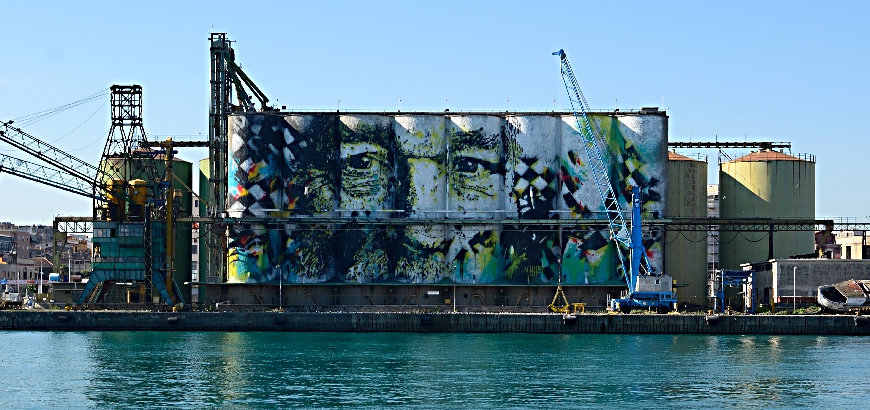 Catania ha accolto di buon grado la street art. Il più grande esempio sono gli 8 silos granari di cemento, visibilissimi dalla SS 114 Orientale Sicula per chi costeggia il porto limitrofo. I silos sono del 1964 e rivolti verso il mare non hanno mai attirato l’attenzione di nessuno, anzi per meglio dire sono sempre stati di grande intralcio alla bellissima visuale che si staglia dietro di loro, eppure dalla realizzazione dell’opera, definita, appunto, “il più grande sguardo sul mare” sono diventati un simbolico segno di accoglienza rivolto a tutti i popoli del mare. La gigantesca opera, annoverata tra i murales più grandi d’Europa, è stata realizzata dall’artista portoghese Alexander Farto, in arte Vhils, e misura mt30x64, quasi 2000 metri quadrati. Il murales rappresenta il volto di un uomo rivolto a oriente nell’atto di osservare l’orizzonte, simbolo di accoglienza verso tutti i popoli del mare alla ricerca di rifugio. Una sorta di attento scrutatore dell’immenso che con il suo benevolo sguardo tende la mano verso luoghi come la Grecia, Cipro, la Turchia, l’Egitto, la Siria, Giordania, Israele, il Libano.
