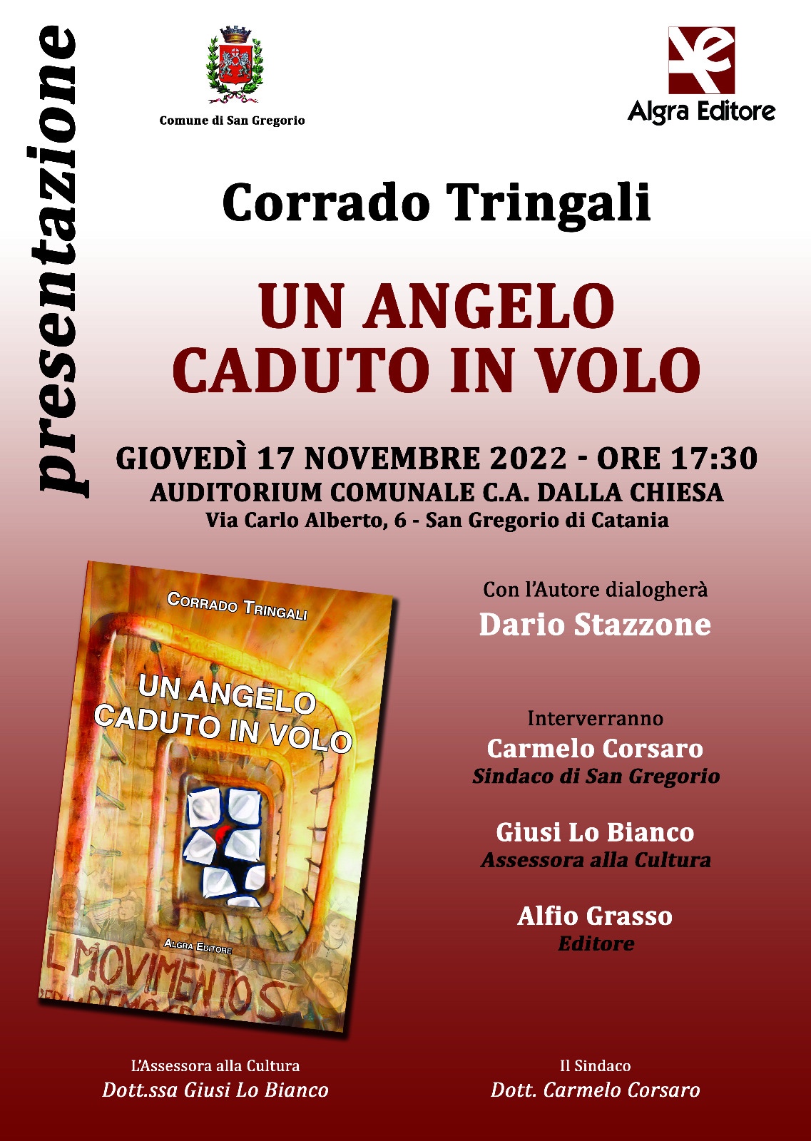 SAN GREGORIO – “Un angelo caduto in volo” è il titolo del nuovo libro di Corrado Tringali pubblicato per i tipi della “Algra Edizioni”. Il romanzo, che narra della tragica, e strana, morte di un alunno della scuola elementare, sarà presentato giovedì 17 novembre 2022, alle ore 17,30 nell’Auditorium comunale “Carlo Alberto Dalla Chiesa”, via Carlo Alberto, 6 a San Gregorio.