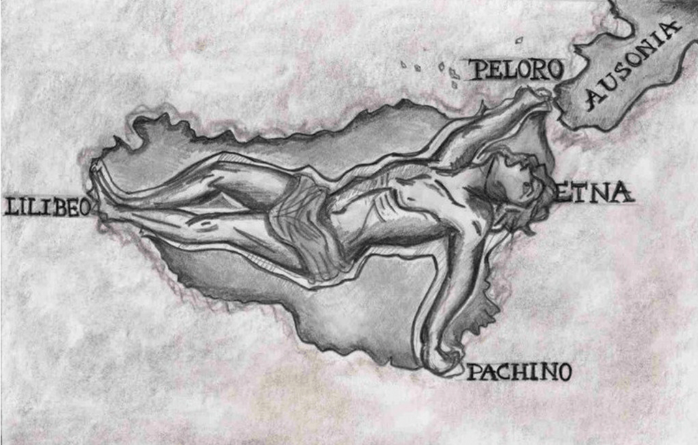 Da qui derivano le rappresentazioni dedicate a Tifeo imprigionato: in posizione supina, le mani sono rivolte a sinistra verso Pachino, a destra verso Peloro; i suoi piedi sono uniti su Lilibeo, mentre la testa sarebbe proprio sotto la montagna, dalla cui bocca sembrerebbero uscire le fiamme, nonché le eruzioni dell’Etna.