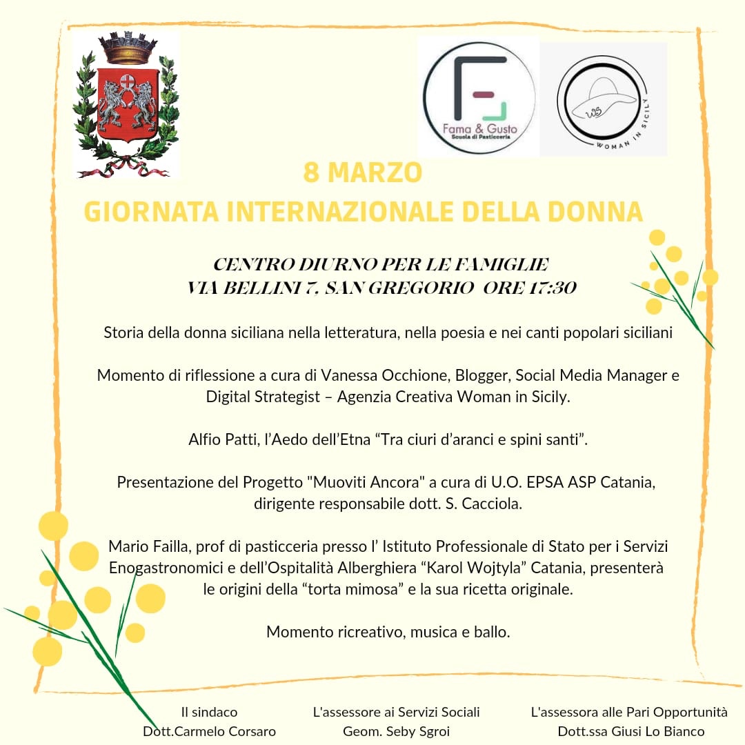 Al Centro diurno per le famiglie di via Bellini 7, a San Gregorio, mercoledì 8 marzo, alle ore 17,30, si terrà un incontro pomeridiano, con successivo momento ludico in serata, dal titolo “Storia della donna siciliana nella poesia e nei canti popolari siciliani” a cura dell’Aedo dell’Etna, Alfio Patti, che interverrà col suo “Tra ciuri d’aranci e spini santi” preceduto da un momento di riflessione a cura di Vanessa Occhione, social media manager dell’Agenzia creativa women in Sicily.Durante la manifestazione sarà presentato il progetto “Muoviti ancora” a cura di U.O. Epsa Asp Catania sul quale relazionerà il dirigente responsabile, dott. S. Cacciola.A conclusione un momento ludico con musica e ballo anticipato da Mario Failla, prof. Di pasticceria che presenterà le origini della “torta mimosa” e la sua ricetta originale.L’iniziativa è stata promossa e organizzata dall’assessorato alle Pari opportunità, diretto da Giusi Lo Bianco, e dall’assessorato ai Servizi sociali guidato da Seby Sgroi.<<Il Centro per le famiglie non smette mai di accogliere e dare vita a iniziative culturali, sociali, ludiche e ricreative – ha sottolineato il vice sindaco Seby Sgroi -, esso è diventato, con le sue molteplici iniziative per anziani e famiglie un vero crogiuolo di vita cittadina».Per l’assessora alle Pari opportunità, Giusi Lo Bianco, «la Giornata internazionale della donna è un momento di riflessione dal quale non possiamo esimerci. Il ruolo che oggi riveste la donna nella società civile e politica è il frutto di battaglie, condotte nei decenni, con le quali sono stati sdoganati pregiudizi e cliché che hanno tenuto la donna relegata agli angoli della società. Aggiungere, poi, dei momenti ludici – ha concluso Lo Bianco – serve a “festeggiare” i traguardi raggiunti anche se c’è ancora tanto da fare».