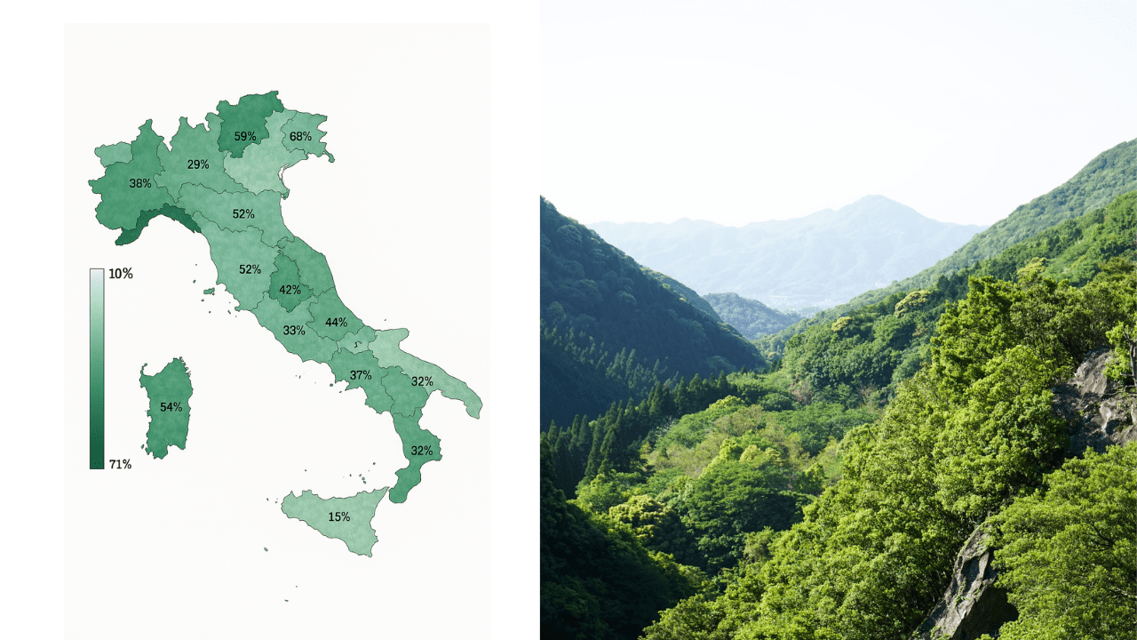 La mappa delle regioni racconta una realtà molto diversificata. Trentino-Alto Adige, Valle d’Aosta, Liguria e Sardegna superano il 50% di territorio coperto da foreste, con picchi come il 71% in alcune aree alpine.
