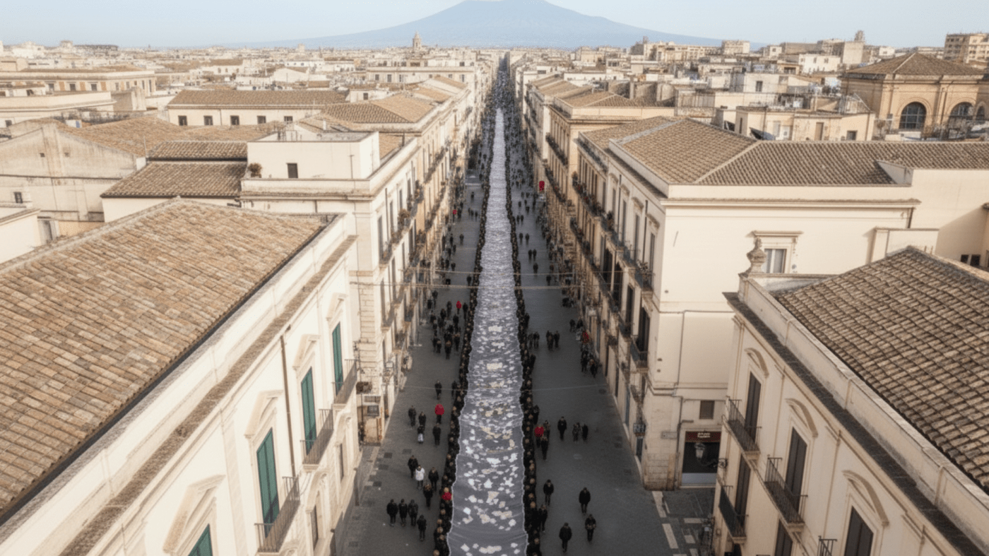 Un velo lungo 300 metri, composto da centrini e ricami tessili, è stato presentato nella giornata del 3 febbraio, attraversando la città da piazza Duomo a piazza Stesicoro. L’opera, ideata dall’artista Domenico Pellegrino, si inserisce all’interno del progetto corale “Tu Sei Agata”, promosso e coordinato dall’associazione Exagonos ETS, in collaborazione con il Comitato per la Festa di Sant’Agata e con il patrocinio dell’Arcidiocesi di Catania e del Comune di Catania.