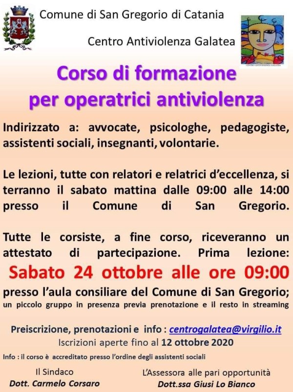 SAN GREGORIO FORMA OPERATRICI ANTIVIOLENZASabato 24 ottobre prima lezione del Corso. Iscrizioni entro il 12 ottobreSAN GREGORIO – Sabato 24 ottobre, alle ore 09:00, nell'aula consiliare del Comune di San Gregorio ci sarà la prima lezione del Corso di “Formazione di operatrici antiviolenza” indirizzato ad avvocate, psicologhe, pedagogiste, assistenti sociali, insegnanti, volontarie.Le lezioni, tutte tenute da relatori e relatrici di eccellenza,... Continua a leggere →