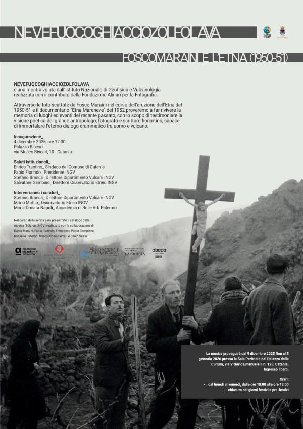 Inaugurata il 4 dicembre al Palazzo Biscari, e visitabile fino al 6 gennaio 2026 presso il Palazzo Platamone di Catania, la mostra "NEVEFUOCOGHIACCIOZOLFOLAVA" restituisce le immagini dell’eruzione dell’Etna del 1950-1951 attraverso lo sguardo di Fosco Maraini. L’esposizione fotografica "NEVEFUOCOGHIACCIOZOLFOLAVA" ripropone al pubblico i cinquanta scatti realizzati da Fosco Maraini durante l’eruzione del 1950-1951 che rischiò... Continua a leggere →