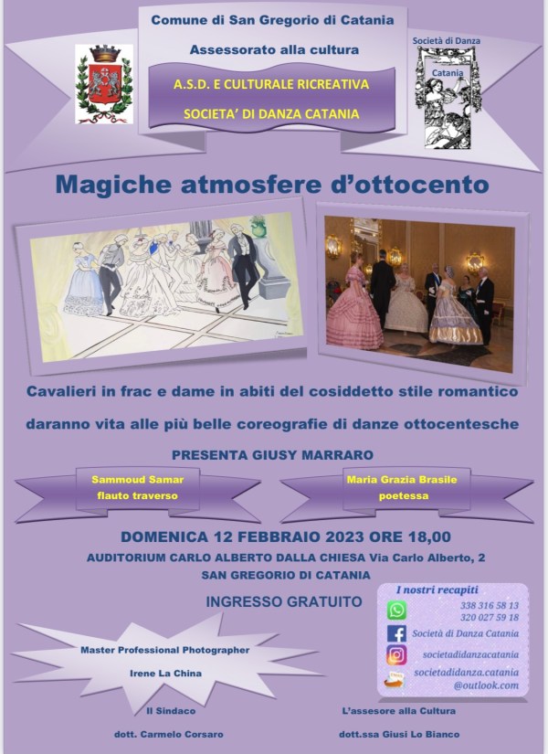 SAN GREGORIO – Domenica 12 febbraio 2023, alle ore 18, nell’Auditorium comunale “Carlo Alberto dalla Chiesa” si terrà lo spettacolo dal titolo “Magiche atmosfere ottocentesche” promosso dall’Associazione “Società di Danza Catania” e patrocinato dall’assessorato alla Cultura diretto da Giusi Lo Bianco. Lo spettacolo sarà presentato da Giusy Marraro e prevede la realizzazione di un ricco repertorio di coreografie... Continua a leggere →