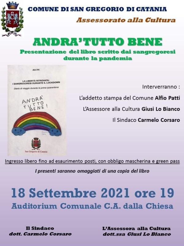 SAN GREGORIO – Sabato 18 settembre alle ore 19, presso l’Auditorium comunale “Carlo Alberto Dalla Chiesa” sarà presentato, e omaggiato agli intervenuti, il libro dal titolo “La libertà ritrovata: i sangregoresi durante il lockdown” nato da un`idea dell’assessora alla Cultura e Pari opportunità, Giusi Lo Bianco. Il testo racchiude numerosi brani scritti dai sangregoresi che hanno risposto... Continua a leggere →