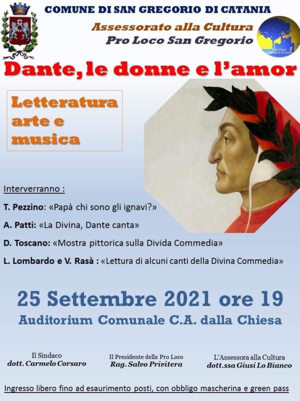 SAN GREGORIO – Sabato 25 settembre 2021, alle ore 19, all’interno dell`Auditorium comunale “Carlo Alberto dalla Chiesa” di Via Carlo Alberto, 6, si terrà la manifestazione culturale-musicale dal titolo “Dante, le donne e l’amor” promossa dall’Associazione Pro Loco di San Gregorio, presieduta da Salvo Privitera, e patrocinata dall’assessorato alla Cultura, diretto da Giusi Lo Bianco. L`incontro... Continua a leggere →
