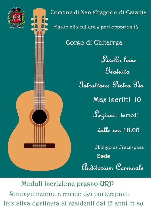 Indetto un percorso musicale livello base. Iscrizioni fino al 29 ottobre SAN GREGORIO: I sangregoresi dai quindici anni in su hanno tempo fino al 29 ottobre 2021per iscriversi al Corso di chitarra, livello base, tenuto dall’istruttore Piero Pia ed organizzato dal Comune di San Gregorio, assessorato alla Cultura diretto da Giusi Lo Bianco.Le lezioni si... Continua a leggere →