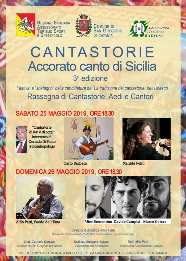 San Gregorio “Cantastorie, accorato canto di Sicilia”. Questo il titolo della “due giorni”, ormai arrivata alla sua terza edizione, organizzata dall’Associazione culturale “Radiusu” di San Gregorio e patrocinata dall’Assessorato regionale Sport, Turismo e Spettacolo e dal Comune di San Gregorio che si terrà il 25 e 26 maggio nell’Auditorium “Carlo Alberto Dalla Chiesa”. Con inizio... Continua a leggere →